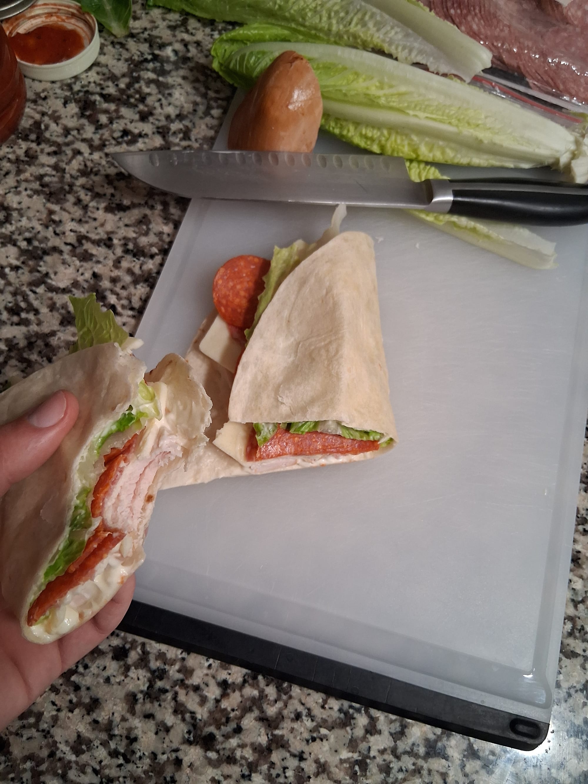 A continuation of my previous blog, here's the sandwich wrap thing I had for dinner last night.Lettuce, havarti, turkey, salami, and pepperoni with mayonnaise Share